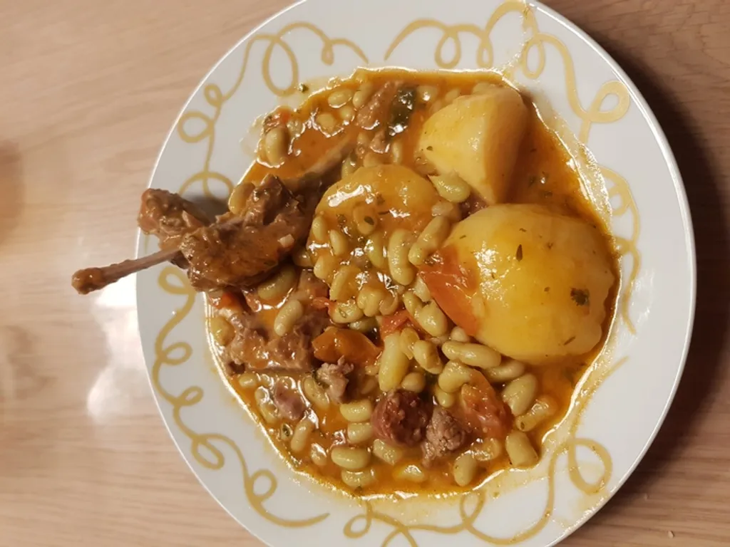 merguez, oignon, ail, persil, pomme de terre, concentré de tomates, tomates cerise, côte d'agneau, kub or, flageolet, matière grasse, sel et poivre