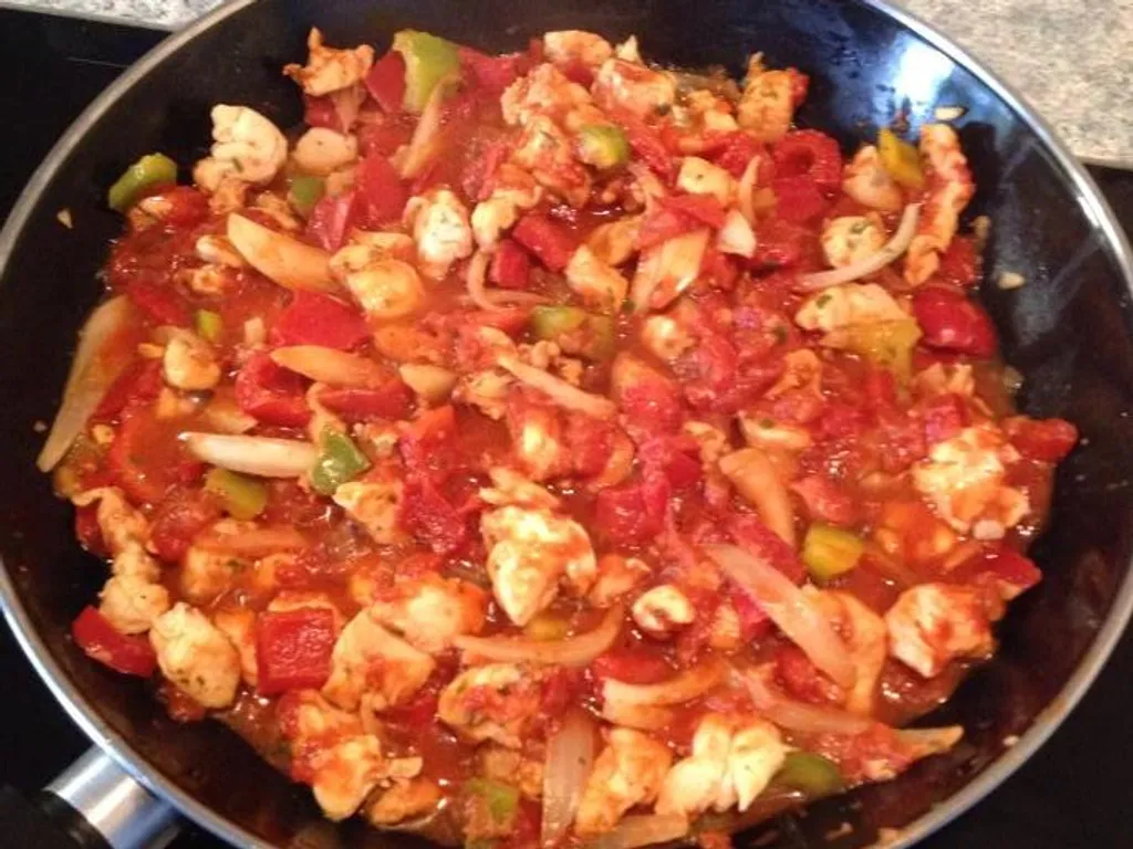 poivron vert, poivron rouge, oignon, ail, tomate, herbes de provence, piment d'espelette, huile, poivre, sel, aiguillette de poulet