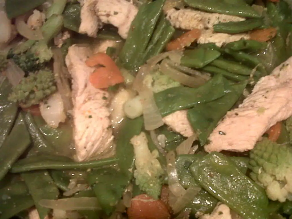 carotte, courgette, oignon, huile d'olive, curry, poivre, sel, cube de bouillon, basilic, aiguillette de poulet, brocoli, petits pois, haricots plats, haricots verts