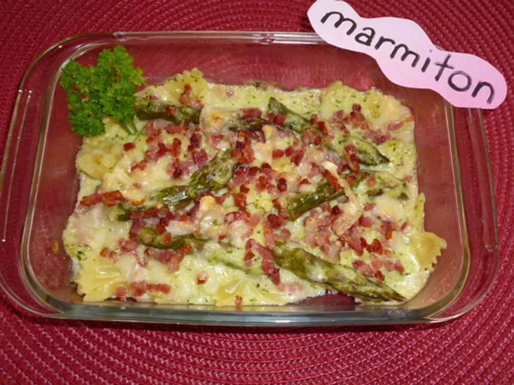 ajouter les pointes d'asperges, le reste de sauce, les lardons et le parmesan.