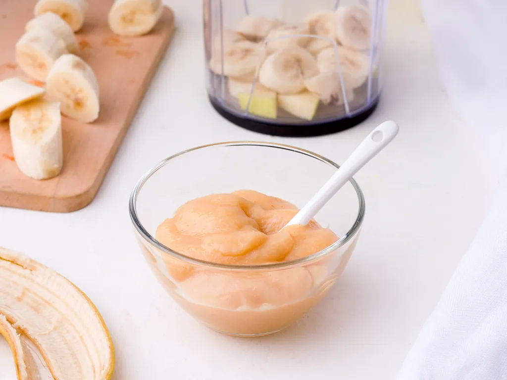couper la banane en rondelles dans une assiette creuse, puis l'écraser avec une fourchette.