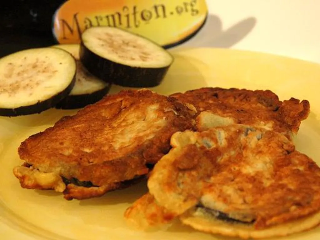 faire chauffer de l'huile, enrober les rondelles d'aubergine dans la pâte et faire frire jusqu'à que se soit doré.