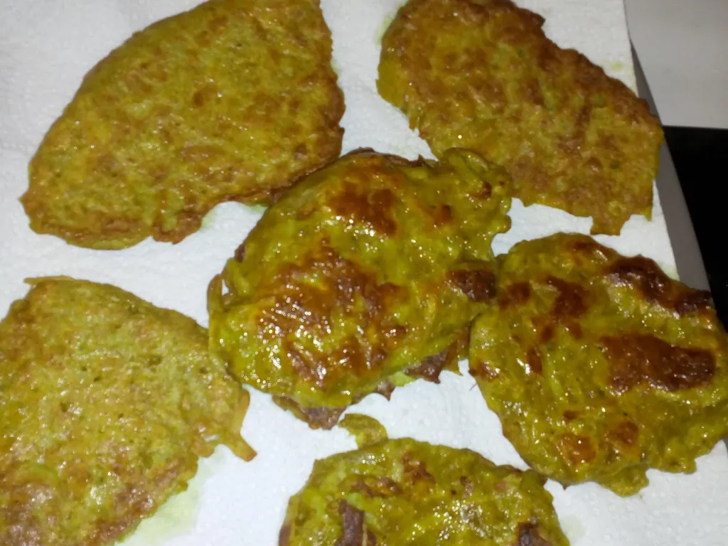 faire chauffer l'huile dans la poêle, y déposer à l'aide d'une cuillère à soupe des petits tas de pâte que vous étalez avec le dos de la cuillère pour former des galettes de 5 à 8 mm d'épaisseur, laisser cuire à feu moyen 8 à 10 minutes puis retourner les beignets et laisser cuire encore 4-5 minutes sur l'autre face, pour que la pâte soit dorée.