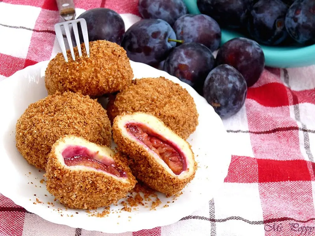 pomme de terre, farine, sucre, cannelle, huile de colza, oeuf, chapelure, prune