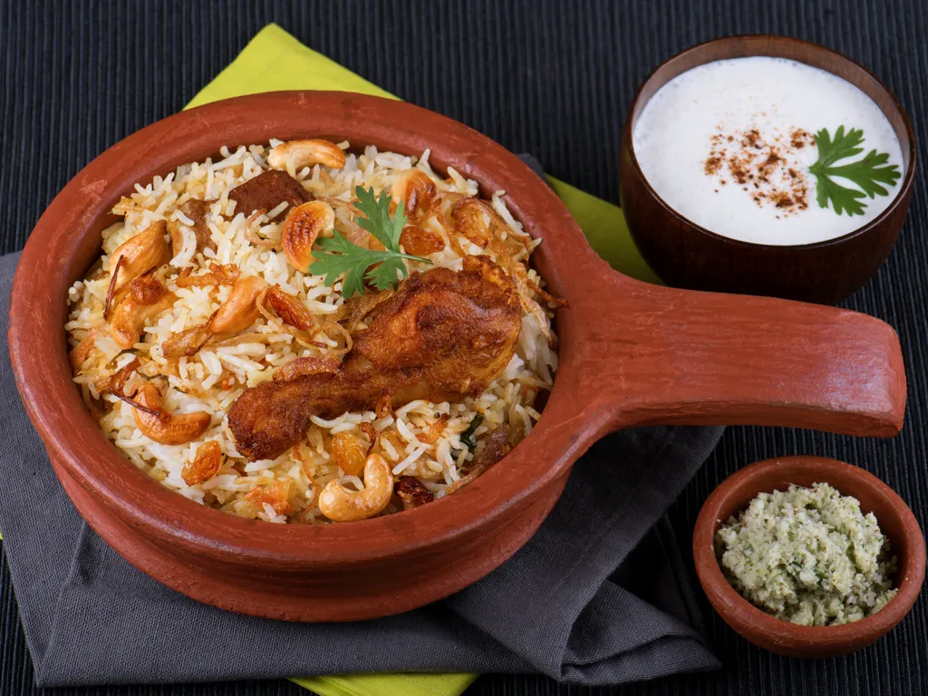 riz basmati, huile, ail, gingembre, oignon, clou de girofle, cannelle, anis étoilé, cardamome, cumin, coriandre, noix de coco, tomate, safran, viande, piment vert, fenouil, menthe, yaourt nature