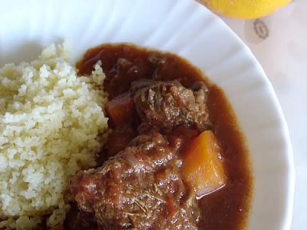 carotte, oignon, ail, concentré de tomates, lardons, vin blanc sec, sel, poivre, cube de bouillon, gingembre, boeuf, écorce d'orange