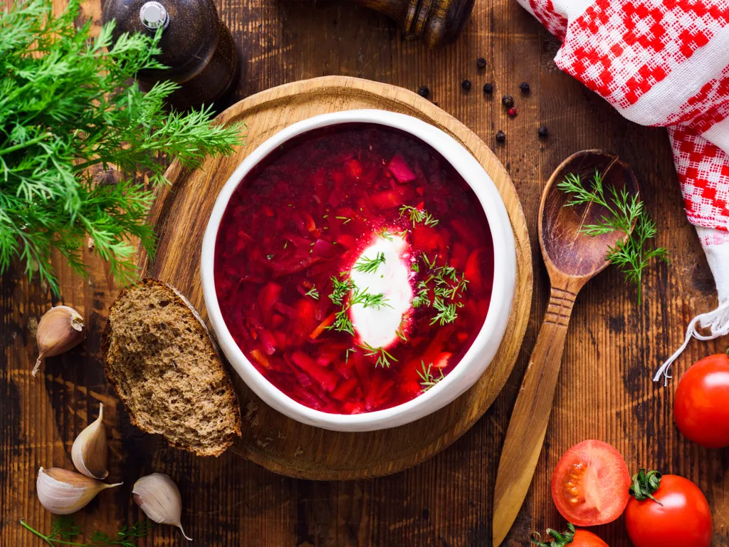 pomme de terre, ail, sucre, vinaigre, jus de citron, beurre, betterave, navet, tomates pelées, blanc de poireau, crème épaisse, oignon, carotte, bouquet garni, macreuse, os à moelle, tomates pelées, sel et poivre