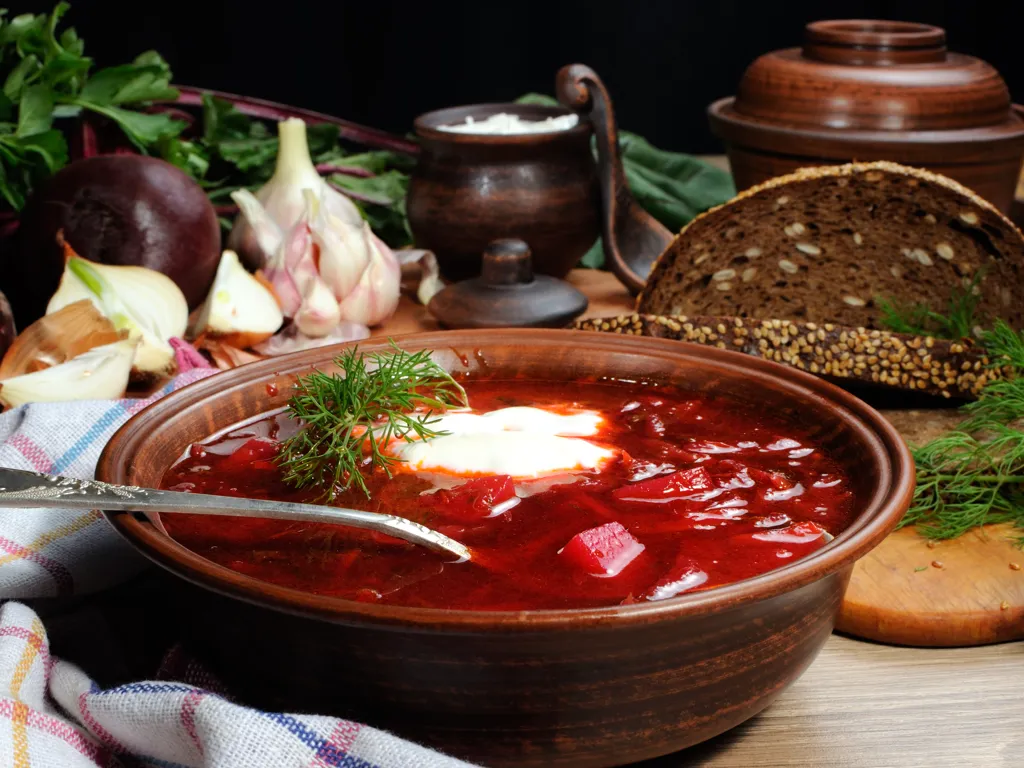 pomme de terre, ail, sucre, vinaigre, jus de citron, beurre, betterave, navet, tomates pelées, blanc de poireau, crème épaisse, oignon, carotte, bouquet garni, macreuse, os à moelle, tomates pelées, sel et poivre