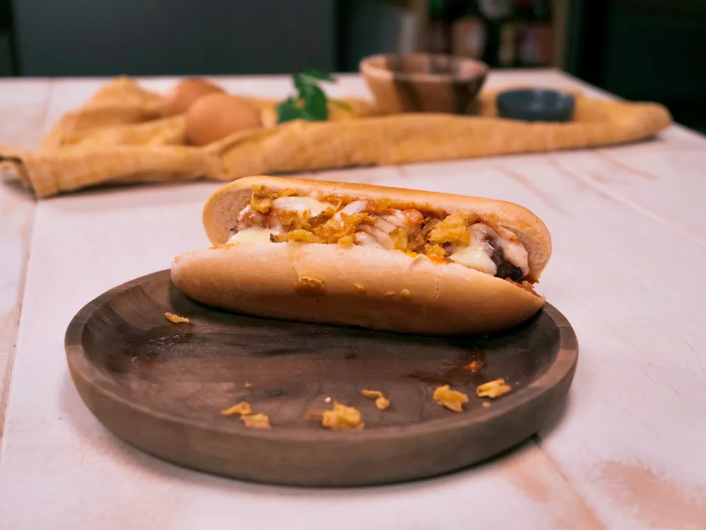purée de tomate, ail, bouillon de boeuf, thym, sucre, laurier, crème liquide, mozzarella, viande hachée, ail, lait, farine, persil, sel, poivre, chair à saucisse, panure, oeuf, mozzarella, oignons frits, pain à hot-dog