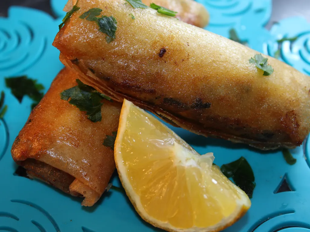 ouvrir les feuilles de bricks et déposer 1 à 2 bonnes cuillères à soupe de farce au centre à gauche de la feuille. replier le haut et le bas de la feuille sur la farce puis rouler en partant de la gauche vers la droite, bien serrer.