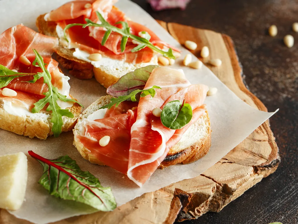 tomate, ail, herbes de provence, huile d'olive, pain de campagne, mozzarella, jambon