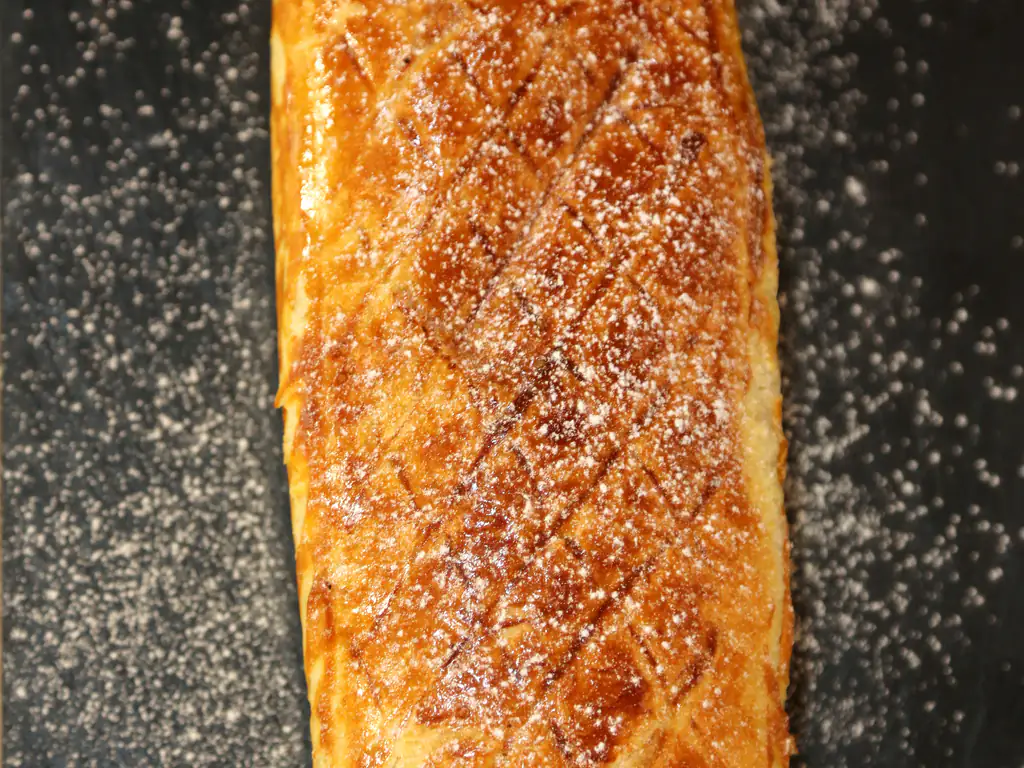 prendre une première pâte feuilletée, la garnir d’une couche de frangipane, mettre dessus une deuxième pâte feuilletée, une nouvelle couche de frangipane et terminer par une couche de pâte feuilletée. tasser légèrement l’ensemble.