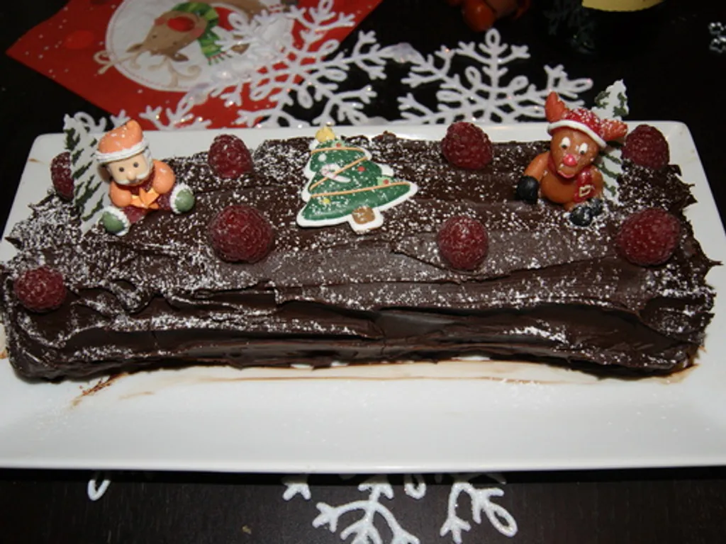 avec le reste du chocolat, faites des copeaux : le placer une heure au froid puis à l'aide d'un éplucheur, confectionner les copeaux. placez-les sur la bûche puis garder au frais une nuit.