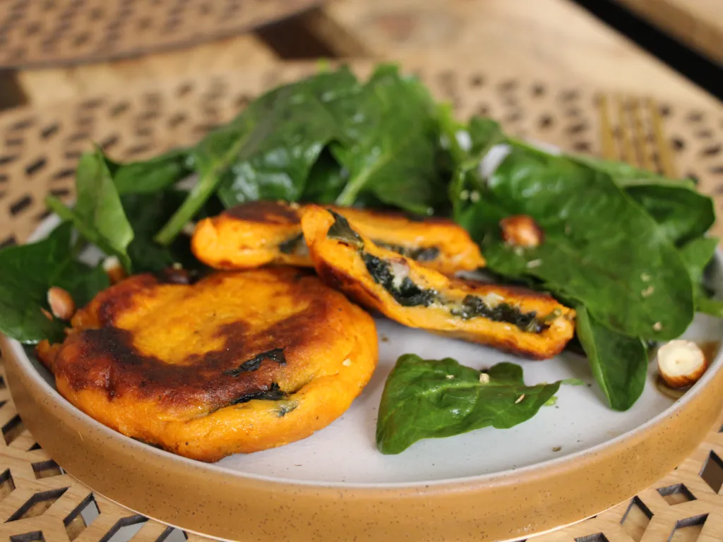 huile d'olive, huile de coco, noisettes, miel liquide, herbes de provence, épinards, chèvre, fécule de maïs, patate douce, farine de riz, sel et poivre, noix de muscade moulue
