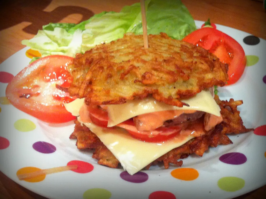 le montage : déposer une galette de pommes de terre dans l'assiette, une tranche de cheddar, le steak, le mélange ketchup mayonnaise, les oignons, une autre tranche de cheddar et une autre galette de pommes de terre.