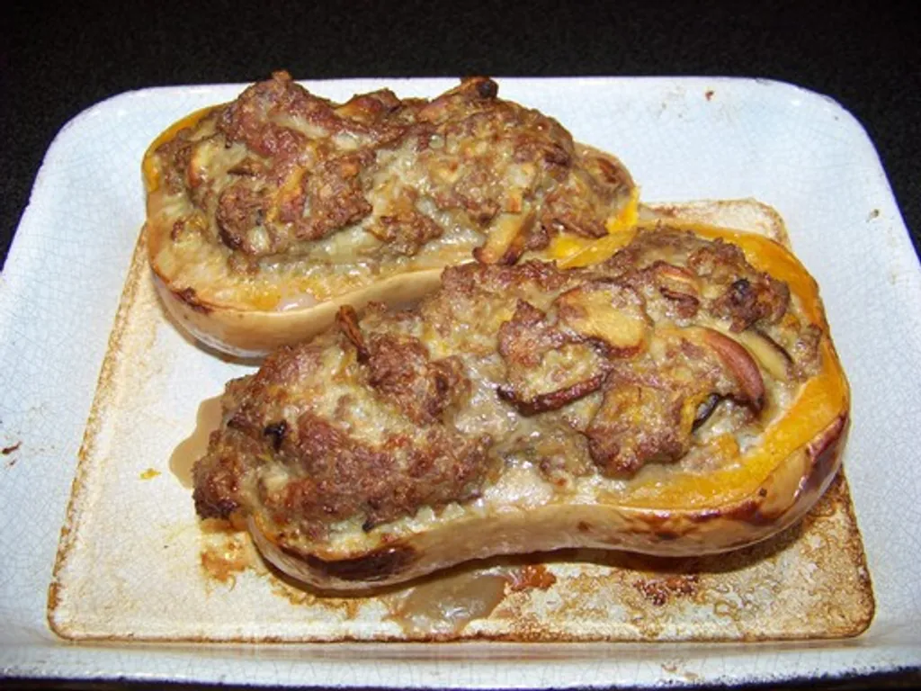 déposer les deux moitiés de butternut dans un plat allant au four, les farcir généreusement, mettre un peu d'eau au fond du plat pour que ça n'accroche pas trop.