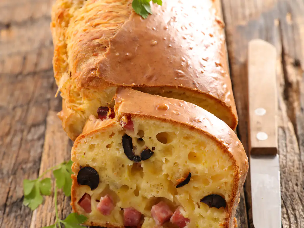 lardons, olives, tomate séchée à l'huile d'olive, emmental, farine, huile, lait, levure chimique, oeuf, sel et poivre