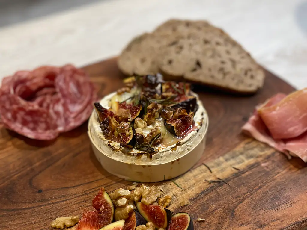placer les figues, les noix et le romarin sur le dessus du camembert. terminer par un généreux filet de miel.