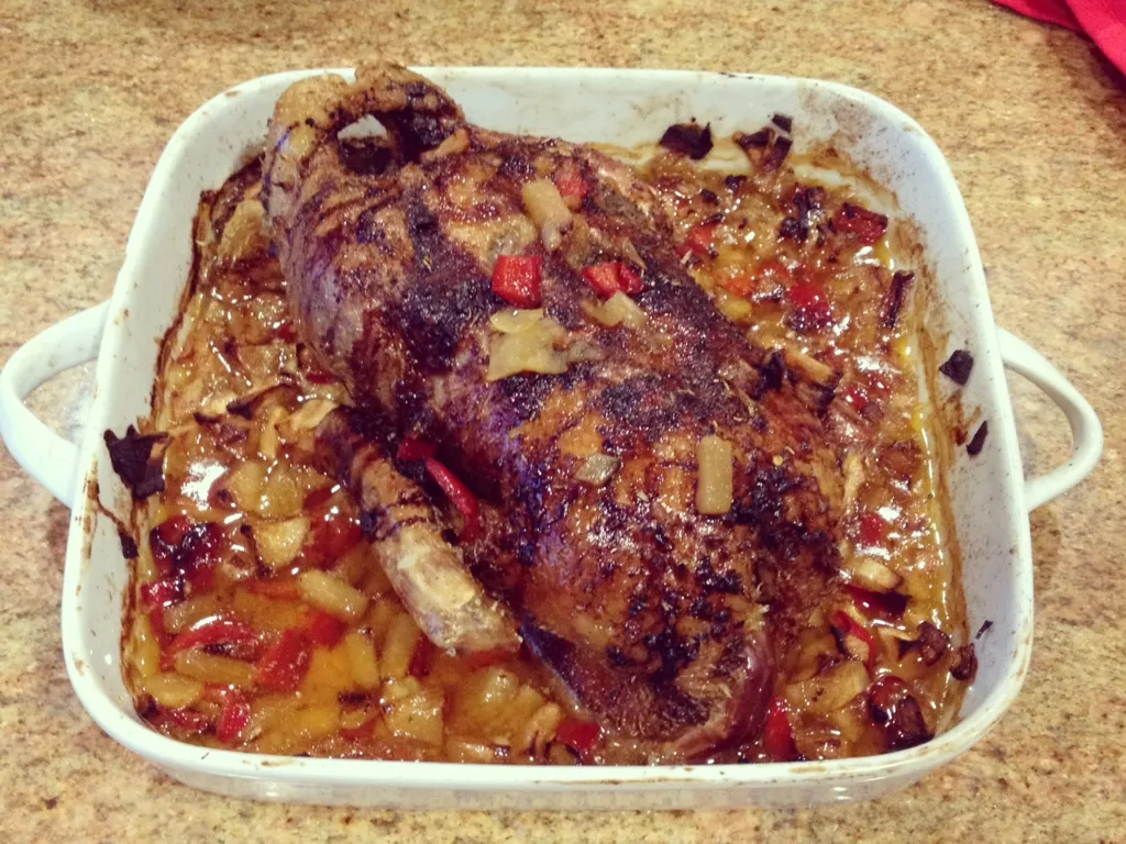 mettez le reste des fruits et légumes dans le plat autour de la canette.