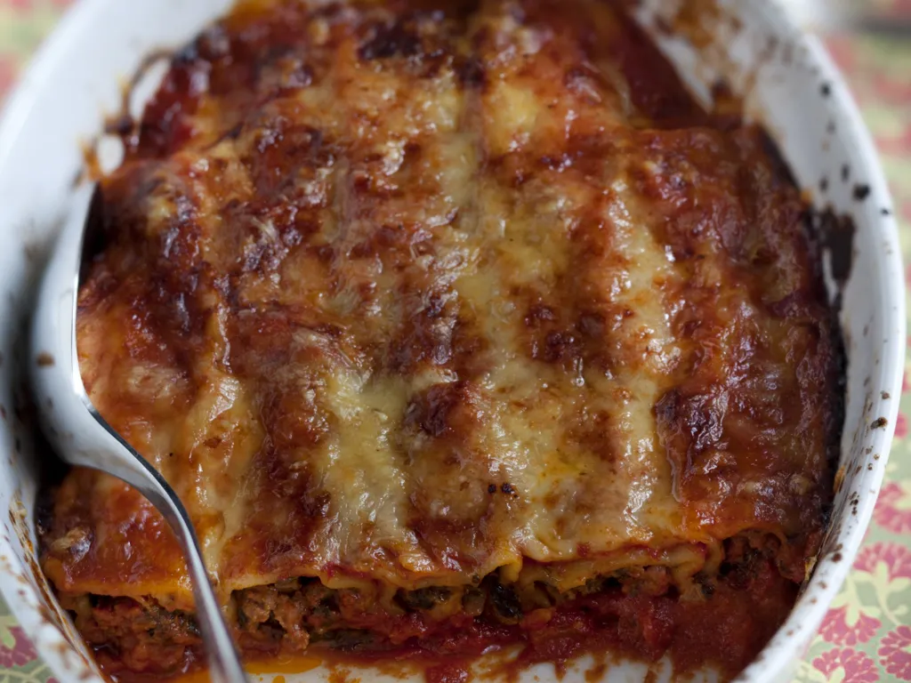 viande hachée, gruyère râpé, oignon, persil, ail, poivre, sel, huile d'olive, canneloni, épinards, coulis de tomate, oeuf