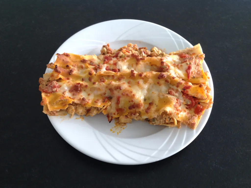 lasagnes, pesto, tomate séchée, olives, fromage râpé, filet de poulet, ricotta, échalote, coulis de tomate