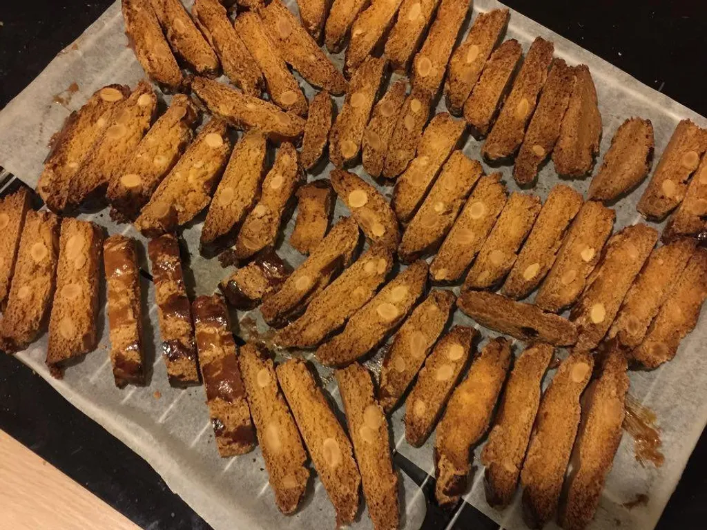 placer sur le papier sulfurisé puis badigeonner au pinceau le haut de jaune d’oeuf. placer dans le four 30 min. en fin de cuisson, couper en tranches et placer rapidement les morceaux sur le côté. remettre au four 10 min (surveiller que ça ne brûle pas).
