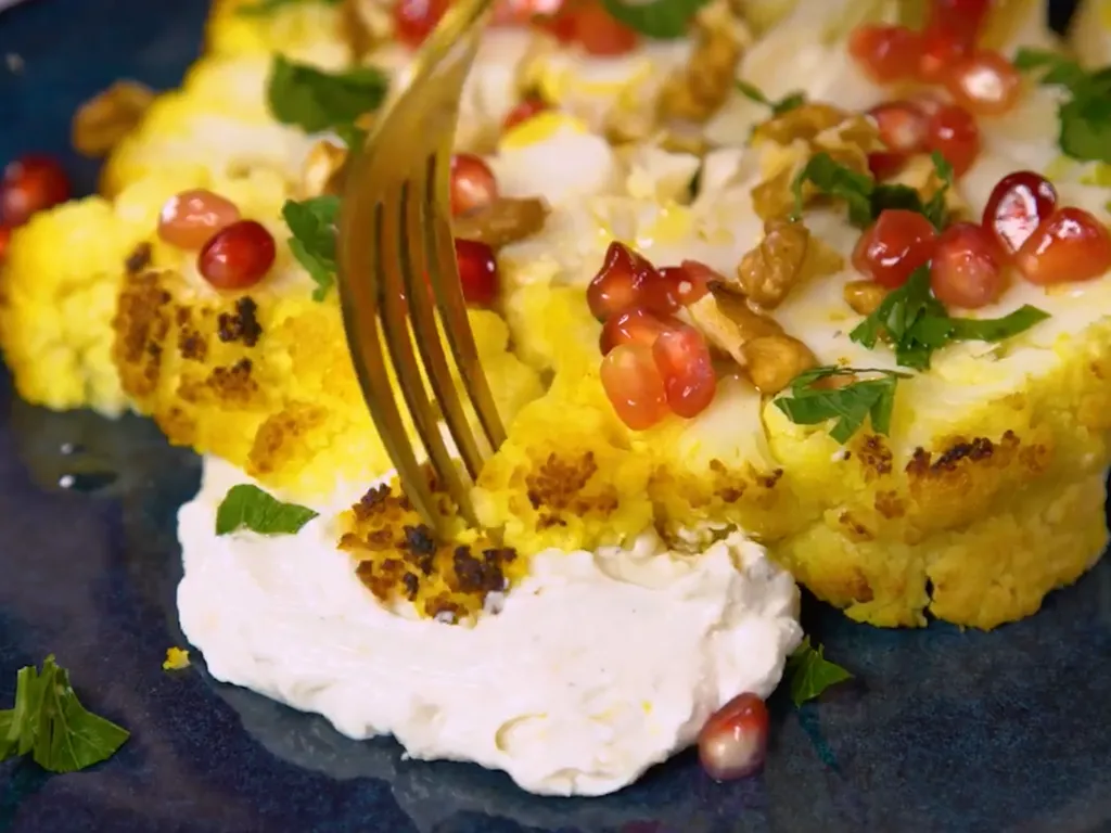 noix, persil, graines de grenade, huile d'olive, jus de citron, miel, ail, tabasco, beurre, huile d'olive, sel, curcuma, chou-fleur, yaourt à la grecque, tahini, zeste de citron, sel et poivre