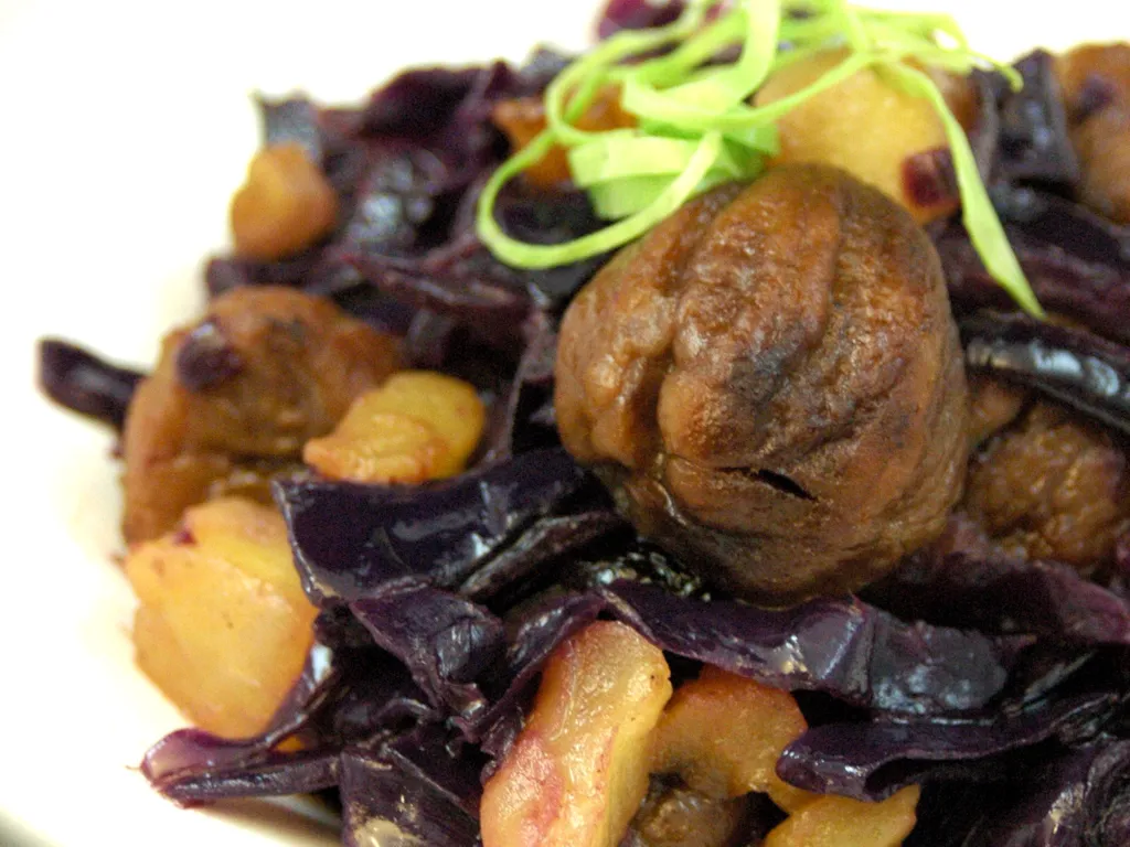 pomme, sucre, oignon, beurre, vin rouge, vinaigre, poivre, sel, chou rouge, châtaignes