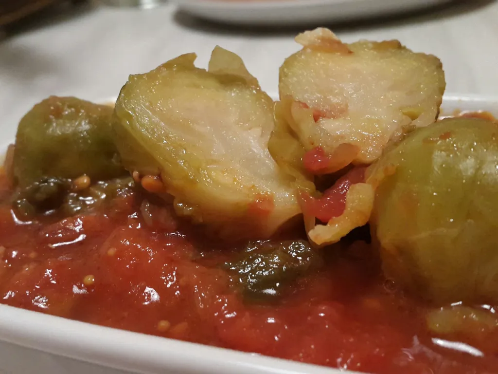 oignon, ail, bouillon, huile d'olive, herbes de provence, poivre, sel, chou de bruxelles, pulpe de tomate, lardons fumés