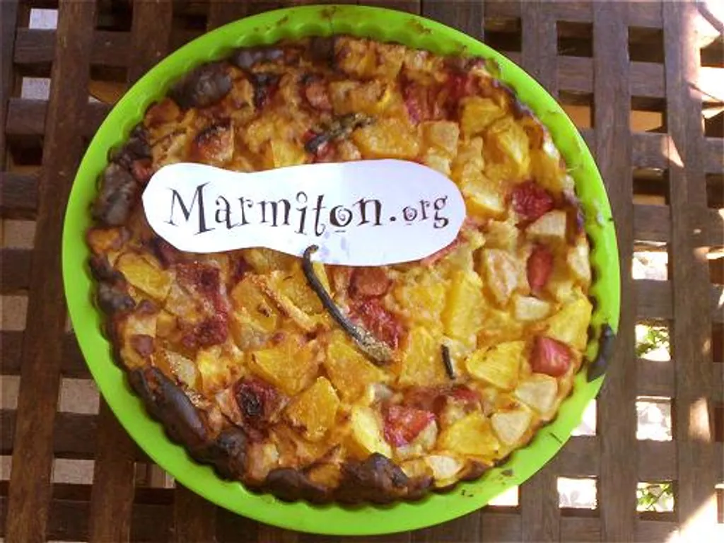 beurrez abondamment un plat en terre ou en porcelaine à feu. disposez les fruits dans ce plat. versez la pâte sur les fruits. parsemez la dessus de quelques noisettes de beurre.