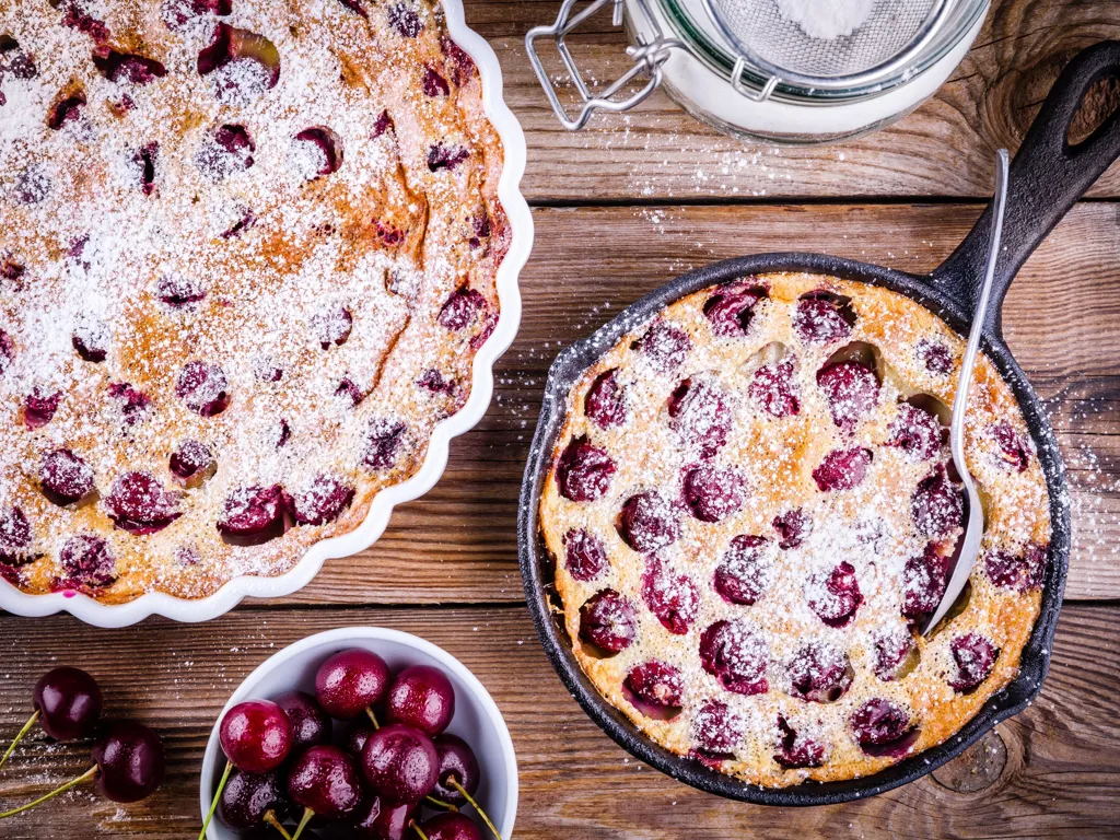 farine, sucre roux, lait, beurre, sel, extrait de vanille, sucre vanillé, cerises, oeuf
