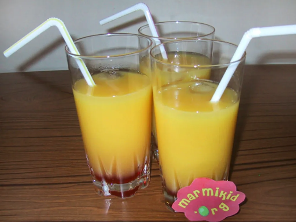 préparez une carafe, verser le jus d'orange, mettre délicatement le sirop de grenadine en le versant bien au centre de la carafe.