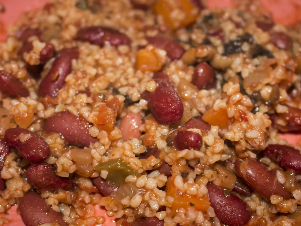 incorporer à cette préparation les haricots rouges, les tomates, le vin blanc, le boulgour et le jus de citron.