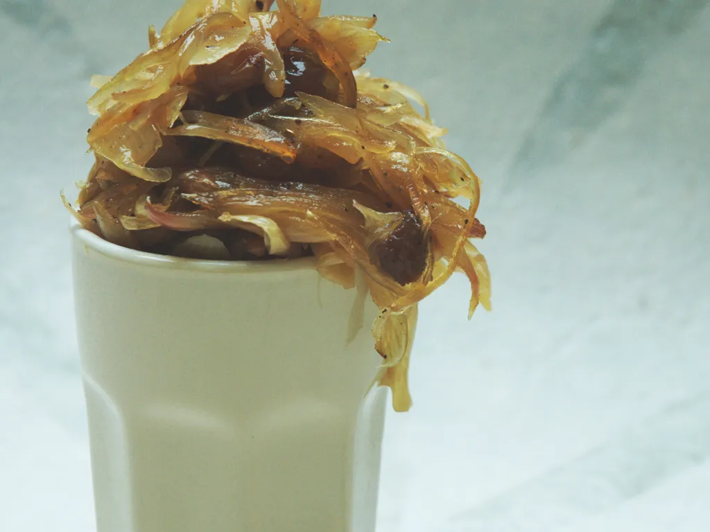 faire chauffer le beurre à feu moyen dans une sauteuse à fond assez épais jusqu'à ce qu'il prenne une teinte noisette, ajouter les échalotes émincées (on peut les laisser entières, c'est plus joli mais moins savoureux), les faire blondir en mélangeant, ajouter les raisins et leur marinade, le sucre, le sel, quelques tours de moulin à poivre.
