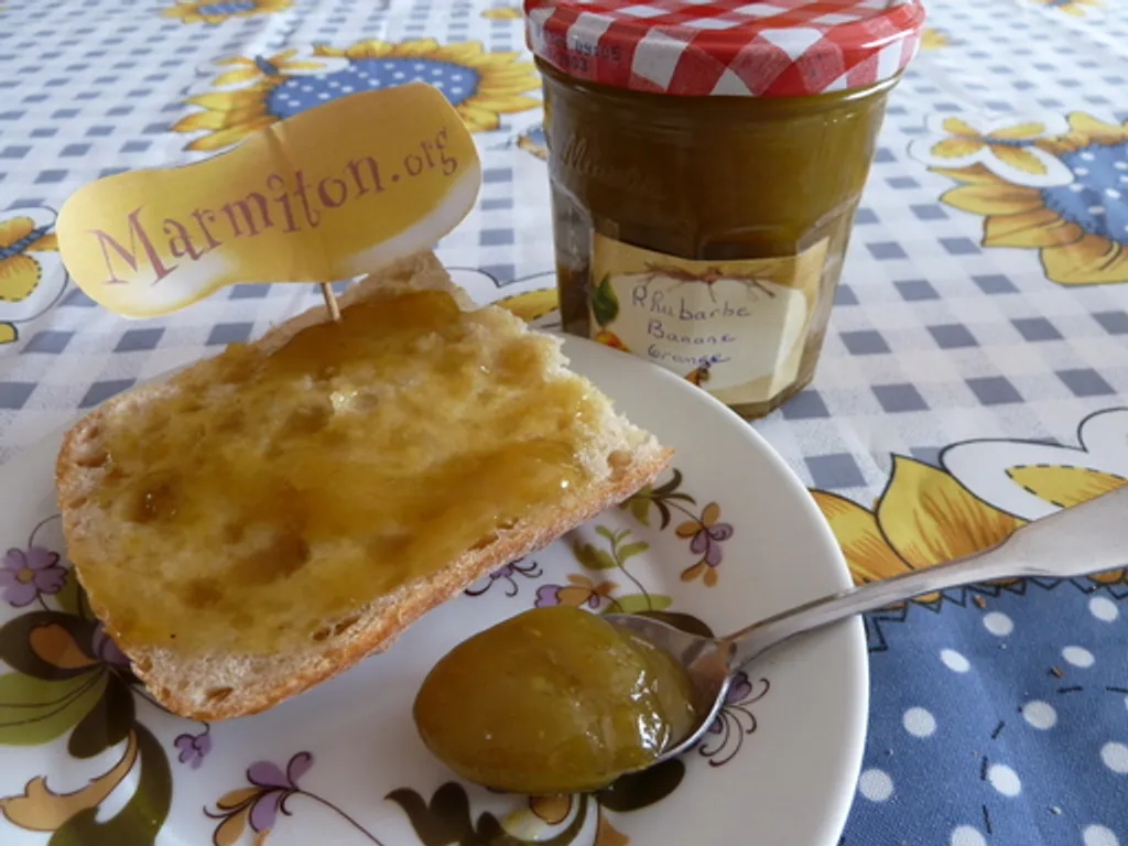 orange, banane, citron, sucre en poudre, rhubarbe