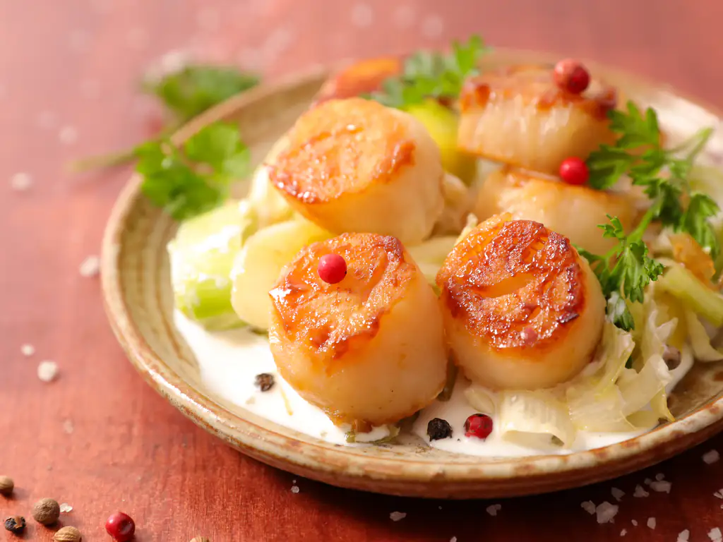 en fin de cuisson, y poser les coquilles st jacques avec la gousse d’ail, la pointe de sel et le poivre. dès que les coquilles sont posées, cuire très doucement afin de raidir seulement de chaque côté. n.b. : la coquille pour rester tendre et fondante doit être juste chaude car trop cuite elle devient ferme.