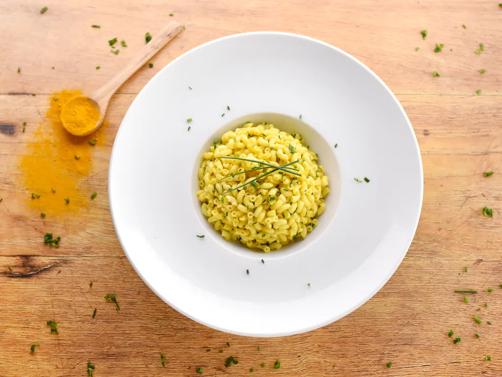 beurre tendre, curcuma, curry, sel, poivre, coquillettes, ciboulette