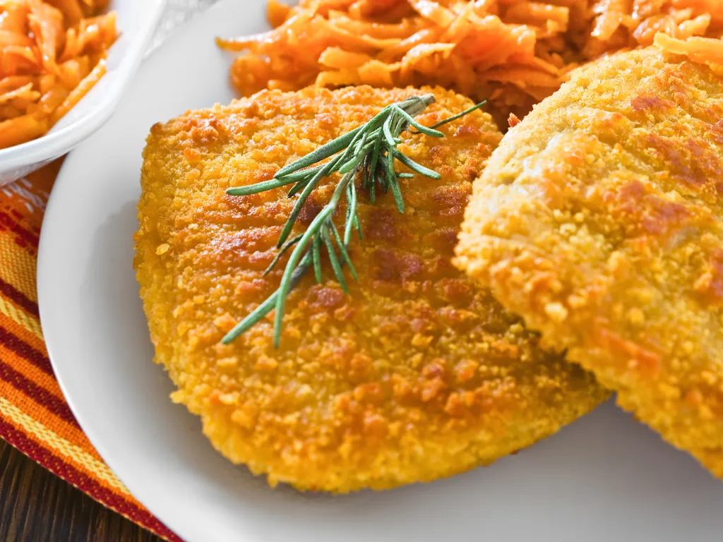 fouetter dans une assiette l'oeuf entier et le lait. dans une autre assiette, mélanger la chapelure et le parmesan.