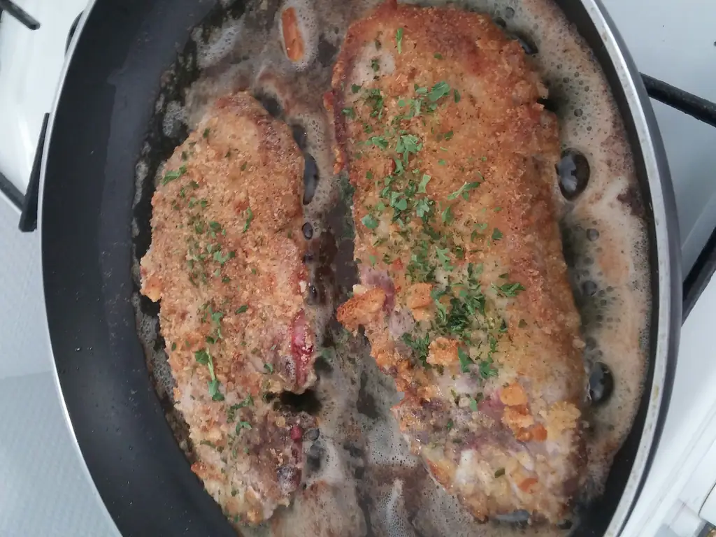 faire chauffer huile et beurre dans une poêle, y faire revenir les côtelettes environ 4 minutes de chaque côté en fonction de leur épaisseur et de vos préférences de cuisson (penser à réduire le feu une fois que la chapelure a doré pour ne pas la brûler).