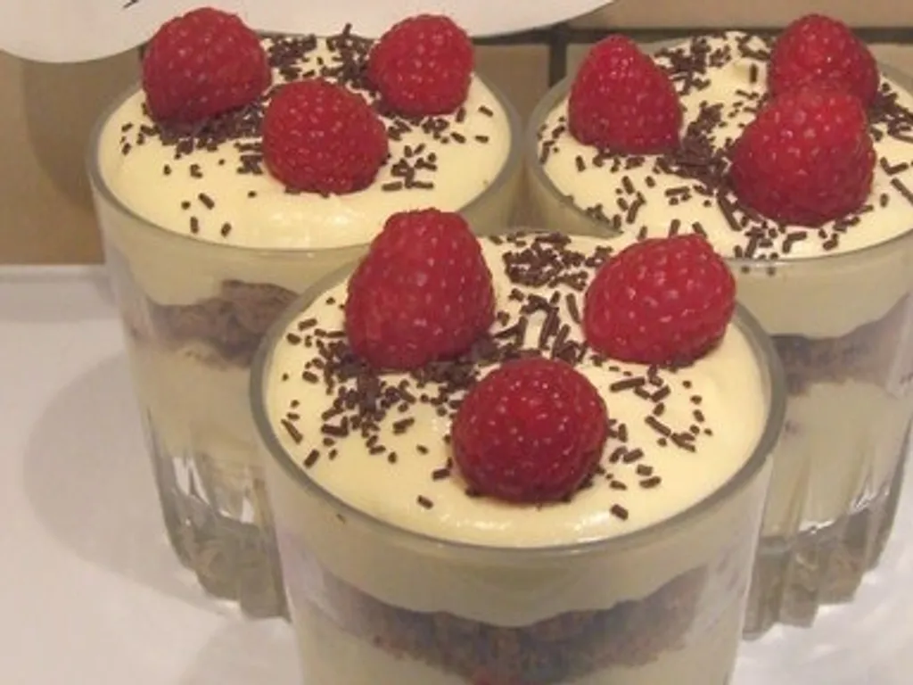lorsque la préparation est homogène disposer dans des coupes à glaces une couche de la préparation suivi d'une couche de framboises, suivi d'une couche de cookies cassés en petits morceaux, suivi d'une autre couche de la préparation.