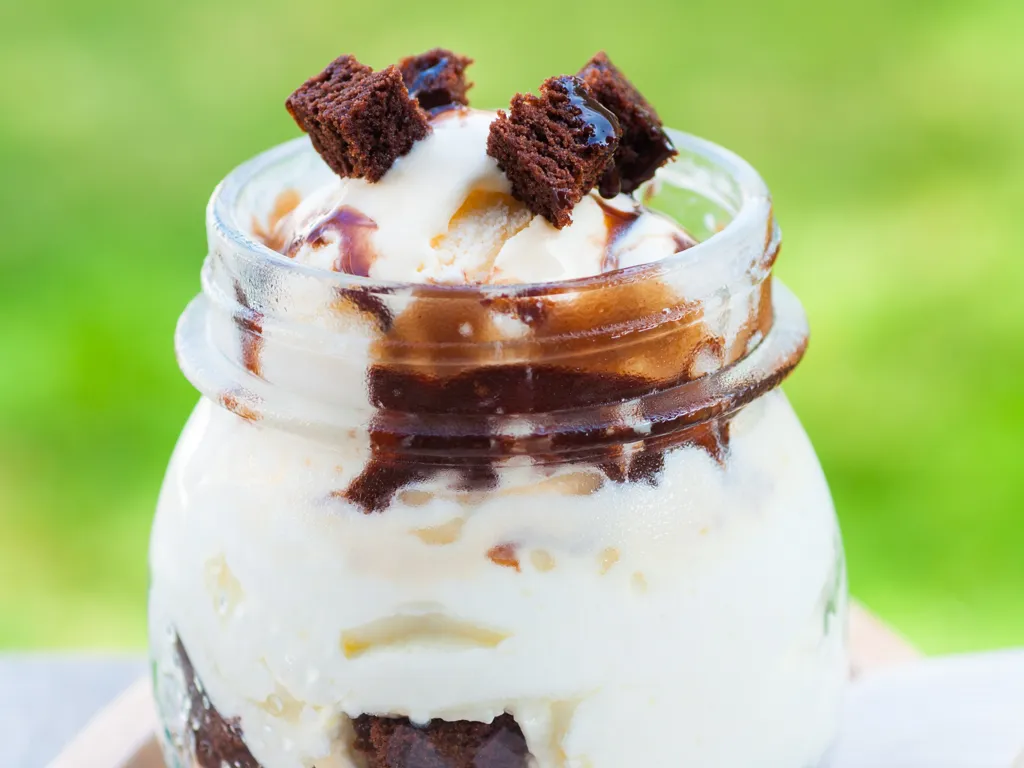 coupez quelques petits morceaux de brownie et placez-les dans une coupe de service (moitié pleine). napper de coulis chocolat et mettre au micro-ondes 30 secondes par coupe.