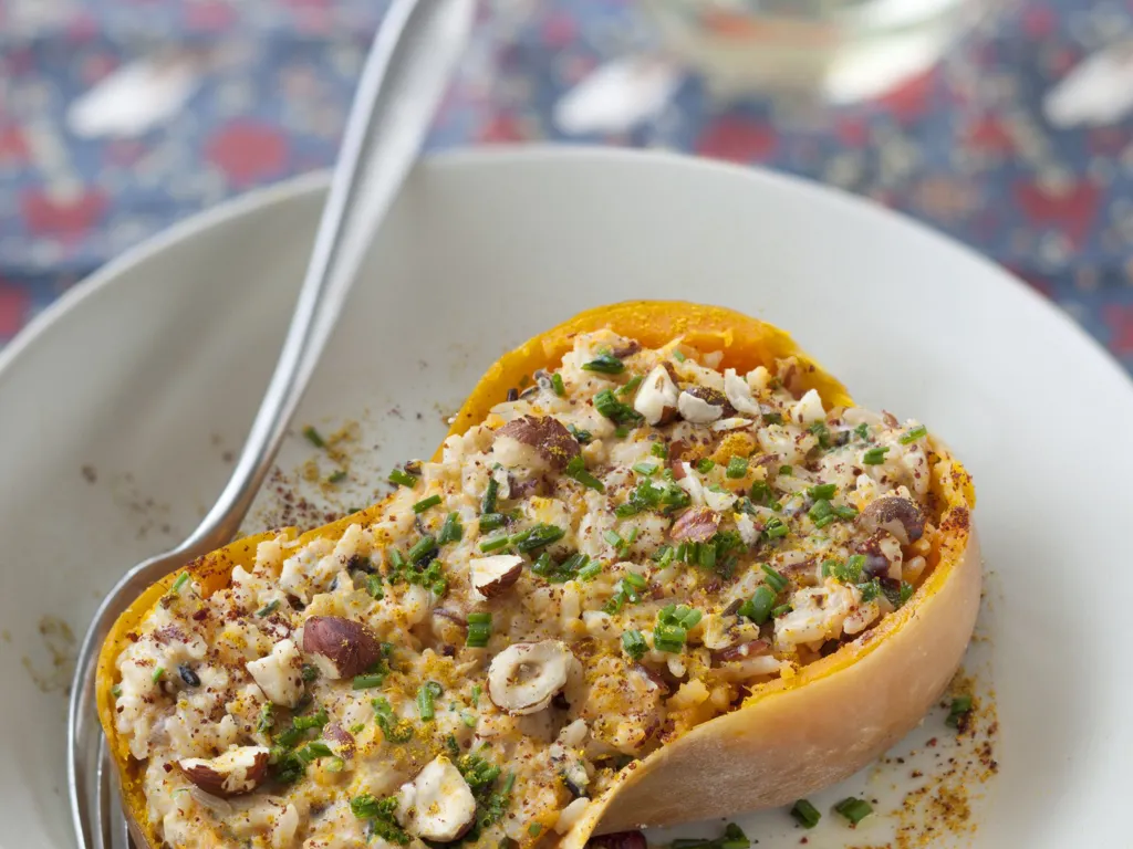 oignon, riz, noisettes, curry, courge, ciboulette, sauce soja, crème liquide