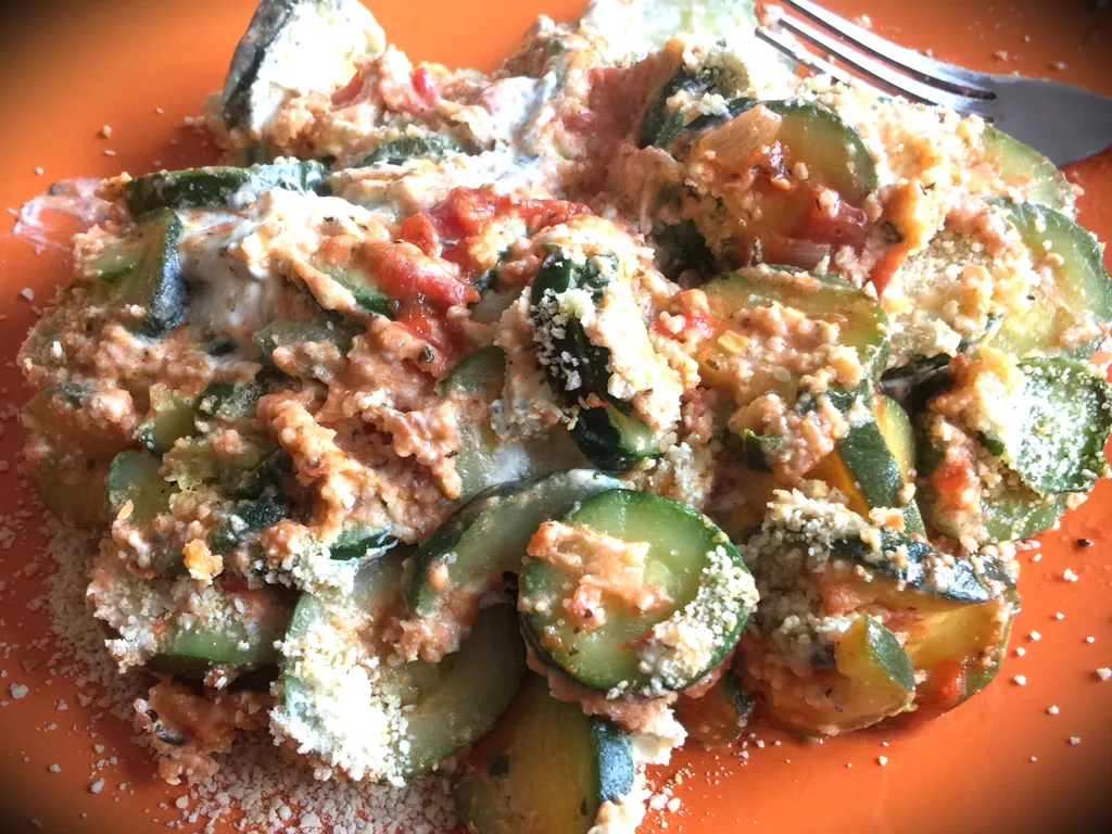 courgette, tomate, huile d'olive, parmesan, poivre, sel, ail, basilic, boursin