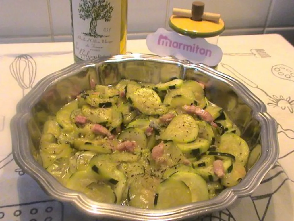 courgette, oignon, huile d'olive, poivre, sel, herbes de provence, lardons fumés, roquefort