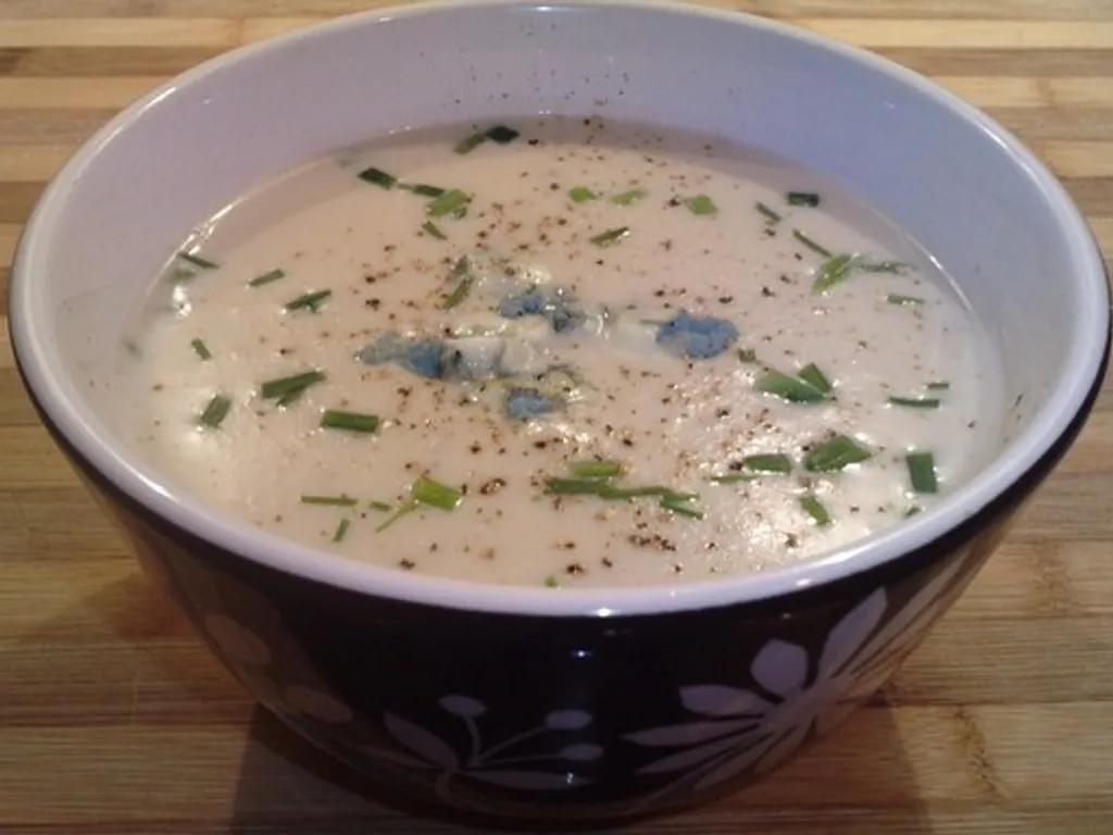 céleri, cerneau de noix, pomme de terre, bouillon, roquefort, crème liquide
