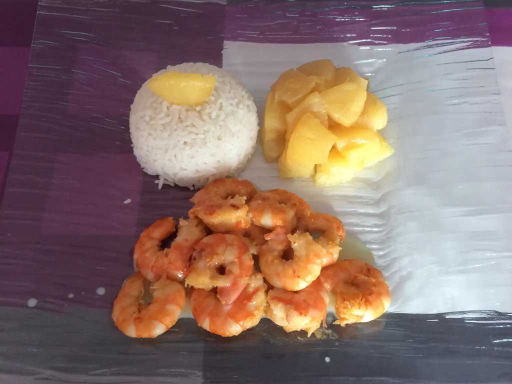 servir à l'assiette avec les crevettes légèrement nappées de la sauce, l'ananas et le riz préalablement moulé dans une coupe.
