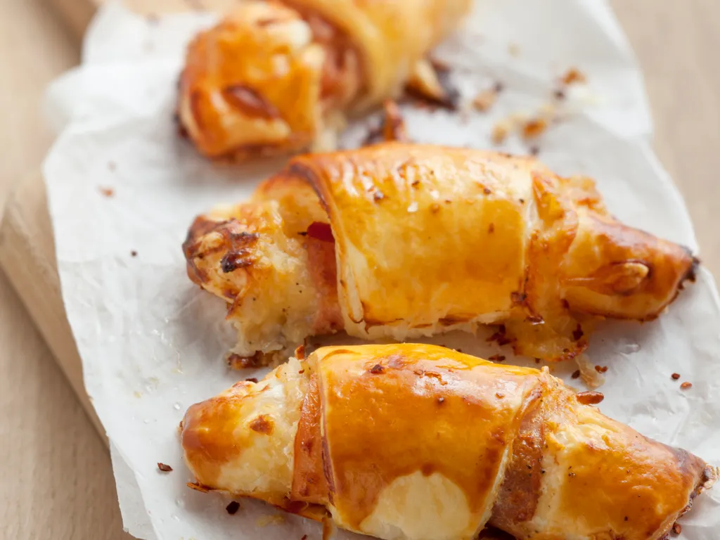 3/ saupoudrez de gruyère râpé une moitié de chaque triangle de pâte, en partant de la base. roulez-les en croissants. préchauffez le four à 180°c (th 6 ).