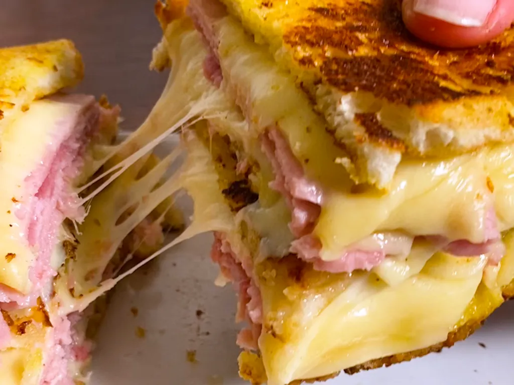 une fois dorée, déposer vos tranches de fromages sur le pain directement dans la poêle, puis votre tranche de jambon coupé en deux. une fois déposé, faites basculer vos deux moitiés afin qu'elle n'en fasse plus qu'une.