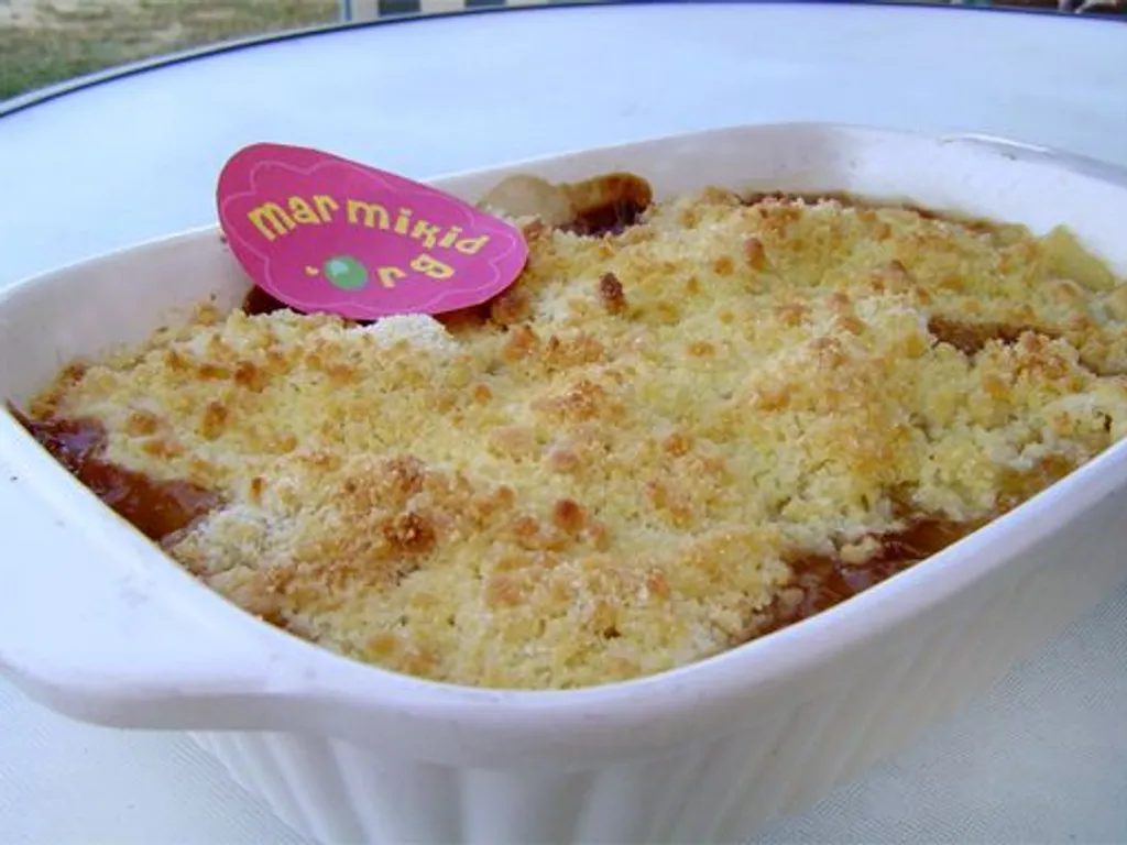 mélangez la farine, le sucre et le beurre du bout des doigts. puis émiettez le tout sur les poires/kinder.