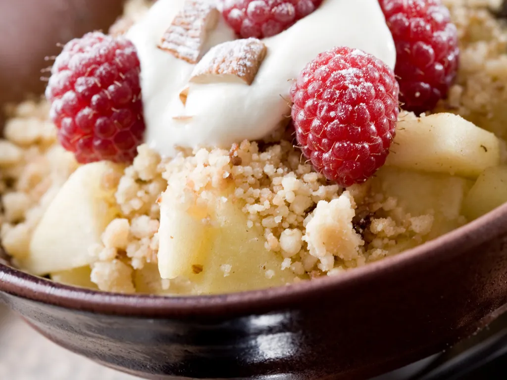 pomme, sucre de canne, farine, amandes en poudre, beurre, crème fraîche, cannelle, vanille, framboises, caramel